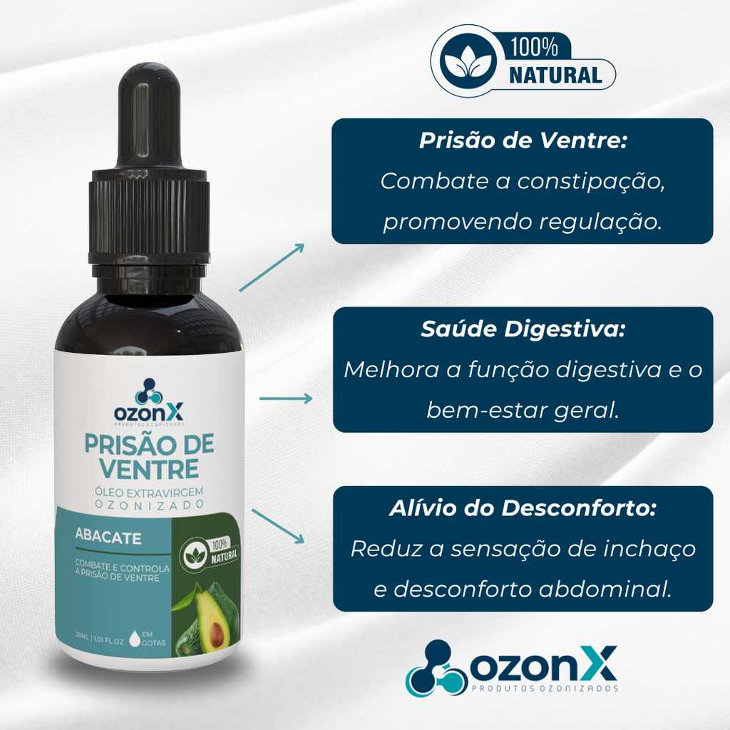 Apresentamos o Óleo de Abacate Ozonizado da OzonX, uma poderosa solução natural e suave para combater e reduzir os sintomas da prisão de ventre. Desenvolvido com cuidado e carinho, este óleo oferece um conforto instantâneo, ajudando a regular o trânsito intestinal e promover a saúde digestiva.