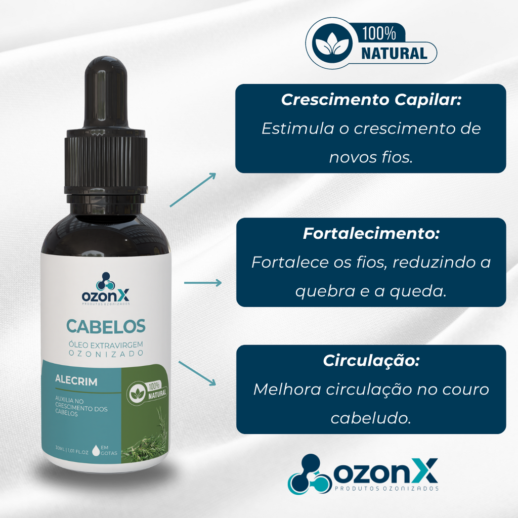 O óleo de alecrim é conhecido por suas propriedades estimulantes e fortalecedoras, ajudando a promover o crescimento saudável do cabelo. O ozônio potencializa essas propriedades do alecrim em até 200%, imagina o poder desse óleo!