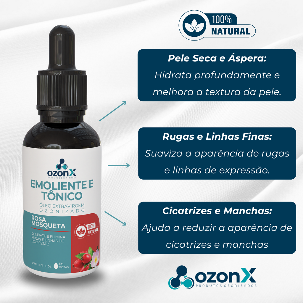 Apresentamos o Óleo de Rosa Mosqueta Ozonizado da OzonX, uma solução natural e poderosa para amaciar e suavizar a pele. Desenvolvido com cuidado e carinho, este óleo oferece um conforto instantâneo, deixando sua pele macia e bem cuidada.