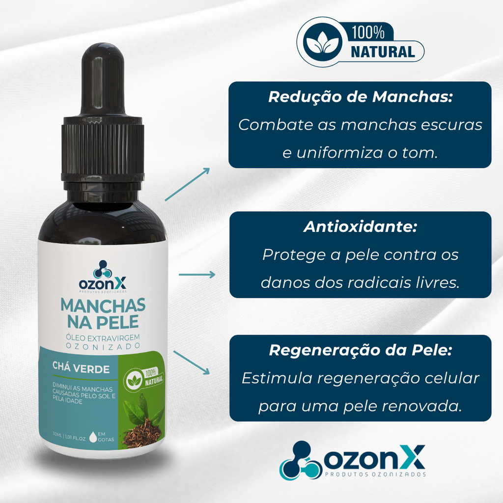 Tenha um suplemento natural às manchas e dê à sua pele o cuidado merecido com o Óleo de Chá Verde Ozonizado da OzonX!