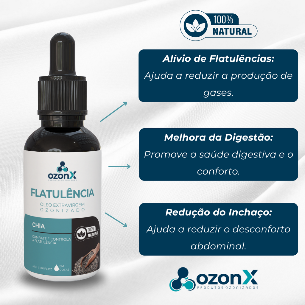Apresentamos o Óleo de Chia Ozonizado da OzonX, uma solução natural e eficaz para aliviar e reduzir flatulências. Desenvolvido com cuidado e carinho, este óleo oferece um alívio imediato, promovendo o bem-estar digestivo de forma segura e natural.
