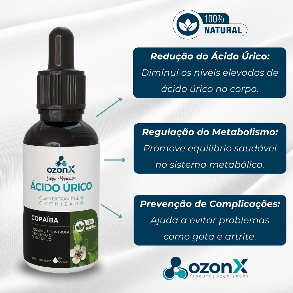Apresentamos o Óleo Premium de Copaíba Ozonizado da OzonX, uma solução natural e poderosa para combater o ácido úrico e promover o bem-estar. Desenvolvido com cuidado e carinho, este óleo oferece alívio imediato, ajudando a equilibrar os níveis de ácido úrico e a restaurar a saúde.