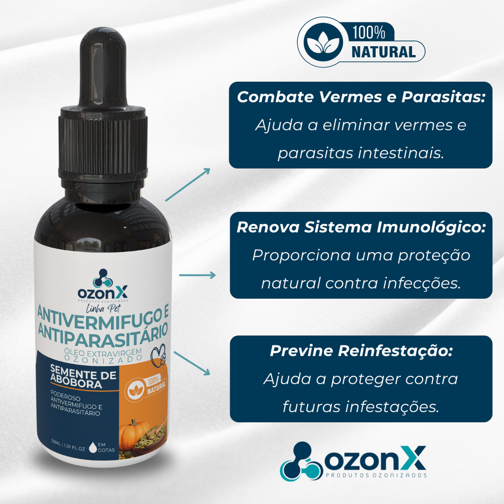O óleo de semente de abóbora é conhecido por suas propriedades antiparasitárias e fortalecedoras, ajudando a manter a saúde intestinal dos pets. O ozônio potencializa essas propriedades da semente de abóbora em até 200%, imagina o poder desse óleo!