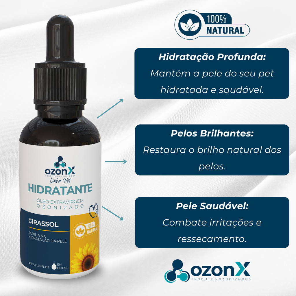 O óleo de girassol é conhecido por suas propriedades hidratantes e nutritivas, ajudando a manter a pele e os pelos dos animais saudáveis. O ozônio potencializa essas propriedades do girassol em até 200%, imagina o poder desse óleo!