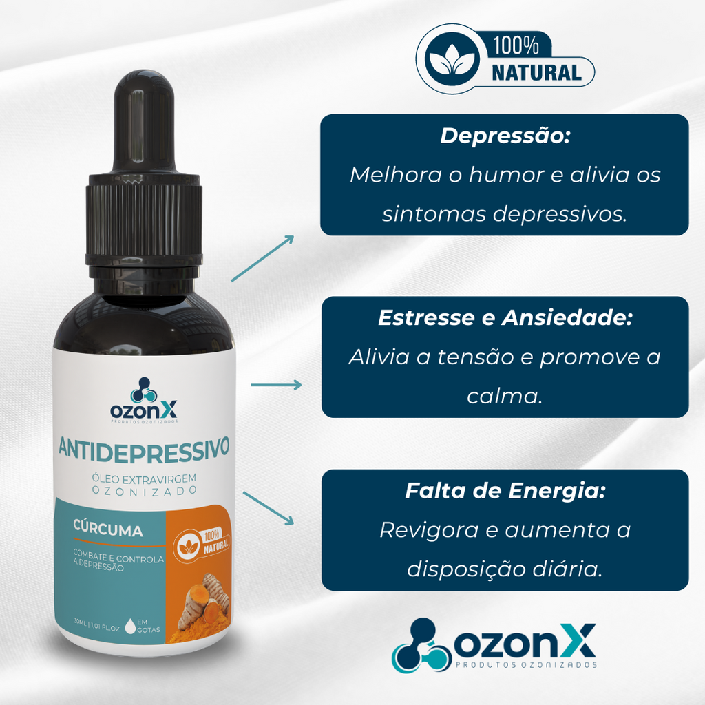 Apresentamos o Óleo de Cúrcuma Ozonizado da OzonX, uma poderosa solução natural e suave para combater a depressão e revigorar o ânimo. Desenvolvido com cuidado e carinho, este óleo oferece conforto instantâneo, ajudando a melhorar o humor e aumentar a vitalidade.
