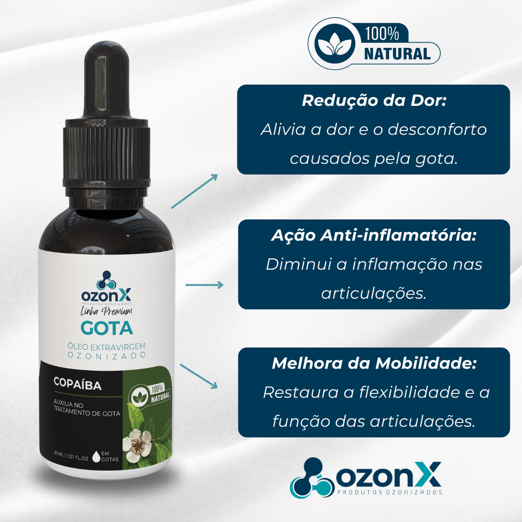 Apresentamos o Óleo Premium de Copaíba Ozonizado da OzonX, uma solução natural e poderosa para combater e aliviar os sintomas da gota. Desenvolvido com cuidado e carinho, este óleo oferece um conforto instantâneo, ajudando a reduzir a inflamação e a restaurar o bem-estar.