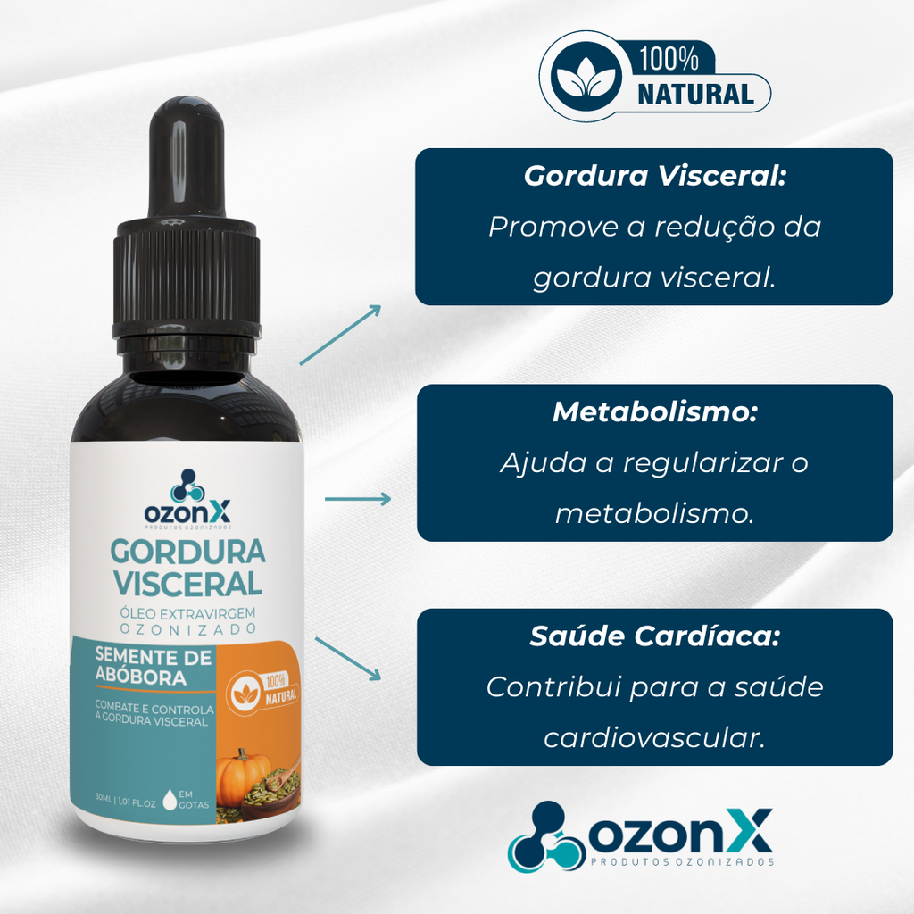Apresentamos o Óleo de Semente de Abóbora Ozonizado da OzonX, uma poderosa solução natural para combater a gordura visceral e promover um metabolismo equilibrado. Desenvolvido com cuidado e carinho, este óleo oferece um conforto instantâneo, ajudando a reduzir a gordura visceral e melhorar a saúde geral.