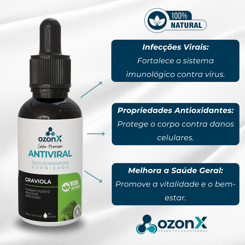 O óleo de graviola é conhecido por suas propriedades antivirais e antioxidantes, que fortalecem o sistema imunológico e protegem o corpo contra infecções. O ozônio potencializa essas propriedades da graviola em até 200%, imagina o poder desse óleo!