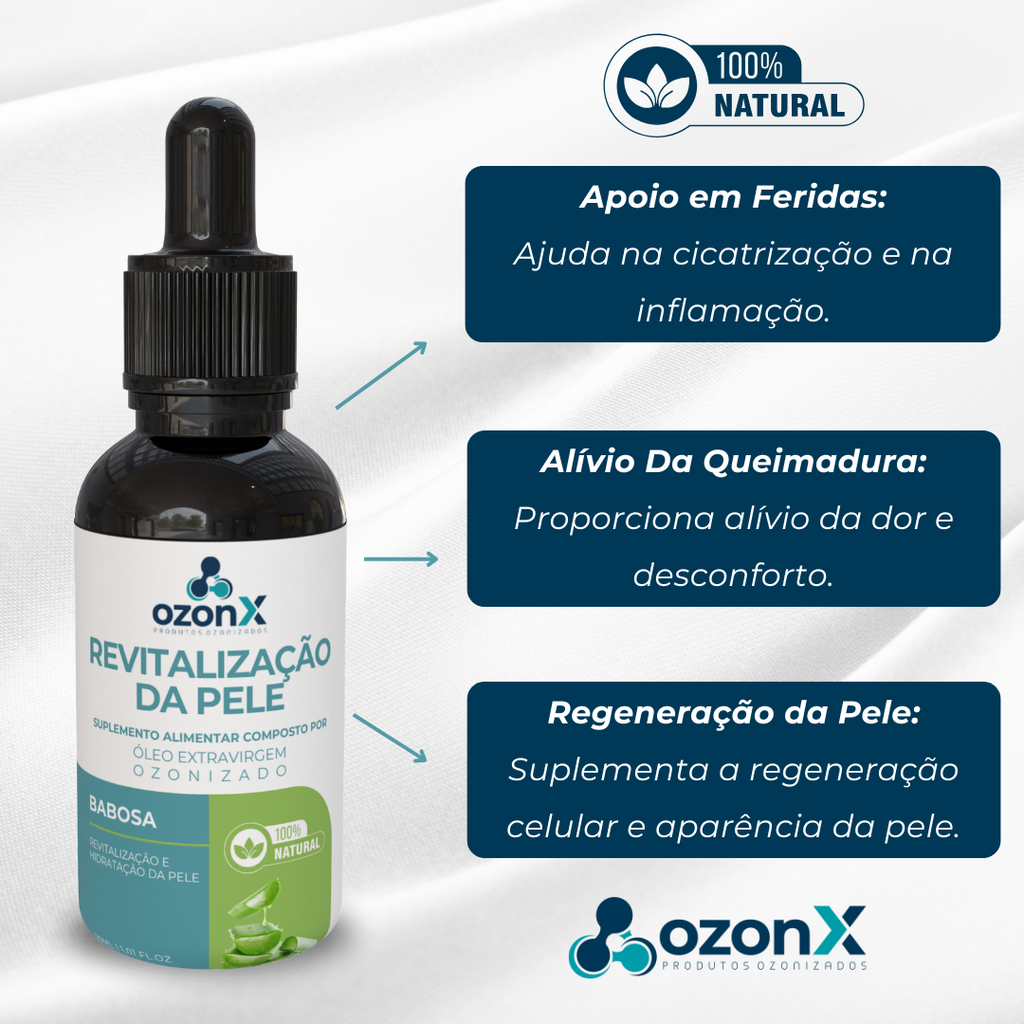 O óleo de babosa é reconhecido por suas poderosas propriedades anti-inflamatórias e hidratantes, ajudando a acalmar a pele e acelerar a cicatrização de queimaduras e feridas. Quando combinado com o ozônio, essas propriedades são potencializadas em até 20x, amplificando sua capacidade de recuperação e proteção da pele.